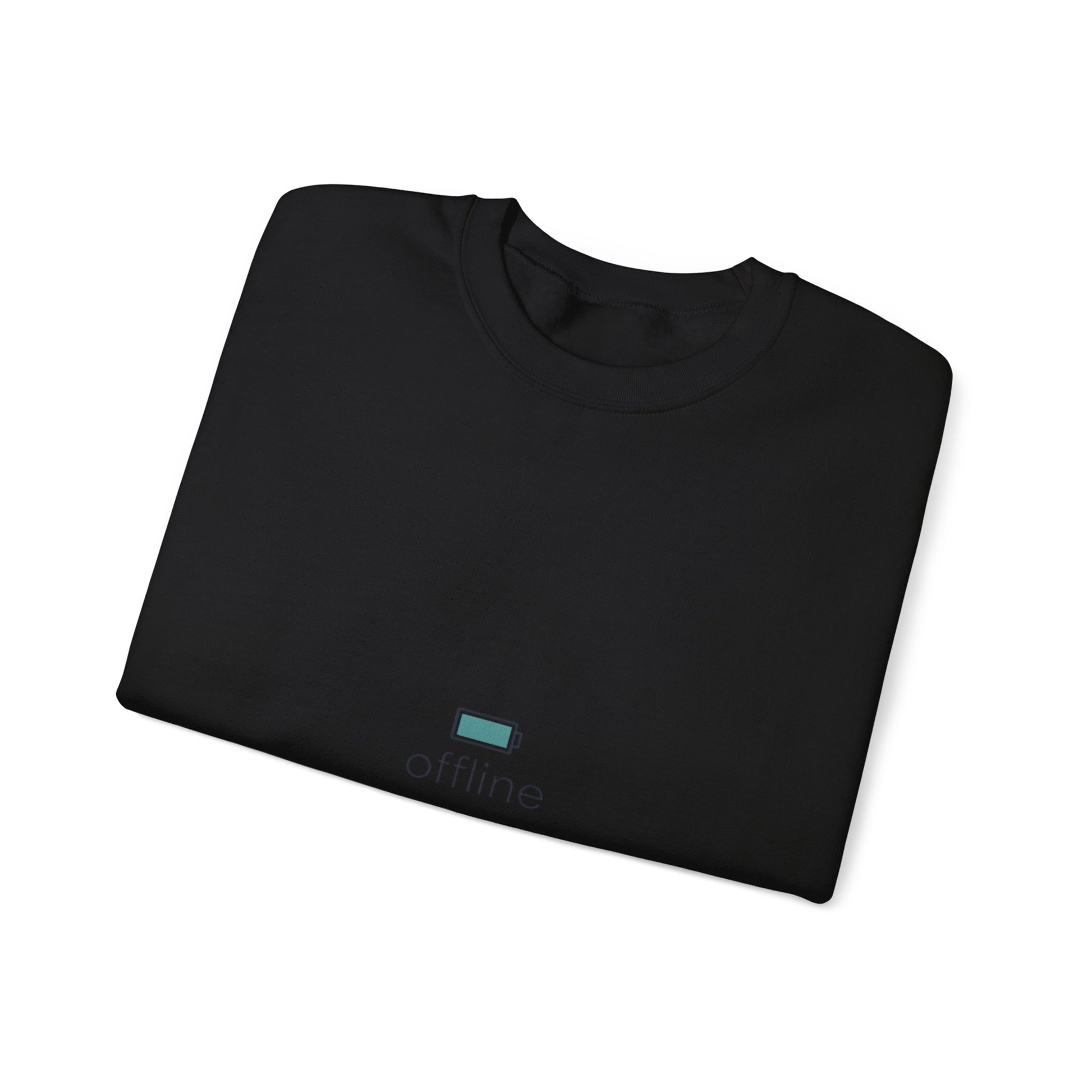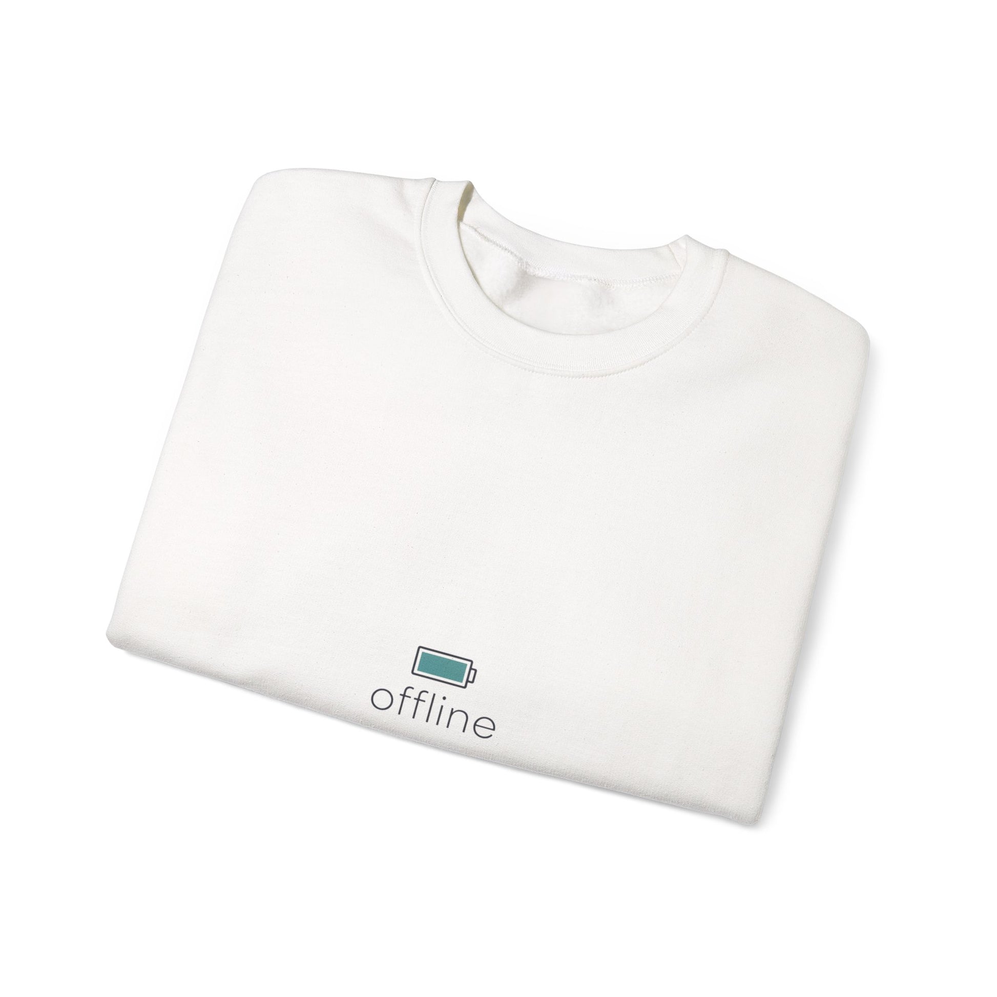 Subtle monoline battery icon with the single-word micro-label “offline” centered on a soft white crewneck — a quiet, normcore statement for urban minimalists who prefer low-key messaging. The tiny embroidered emblem and lowercase micro-sans word create a restrained, whisper-brand look that layers easily with jackets or notebooks and reads as an intentional mood cue rather than loud branding. Suited to everyday wear, it signals digital pause and calm for commuters, students, and anyone practicing slow, minimal dressing.